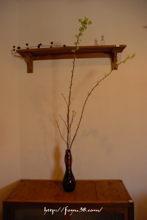 ところで枝の長さに対して花瓶が小さいようにも思うのだけど・・これ以上大きくて似合う花瓶がないのです。幸いこの枝は重くないし、1週間2週間と楽しむ間に水切りで少しずつ短くなっていきますから、これでよしとしました。