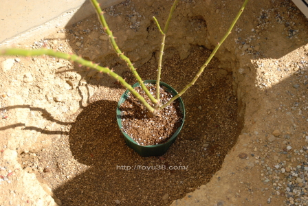 バラ苗は50×50×深さ50cmくらいの穴を掘って植え付けるんです。