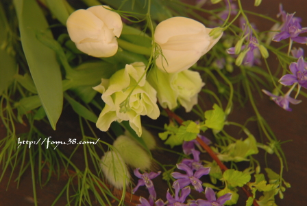 緑がかった白のアネモネに、ブルーと言いつつパープルなブルースプレーを合わせました。