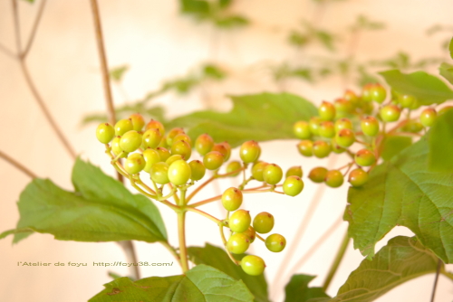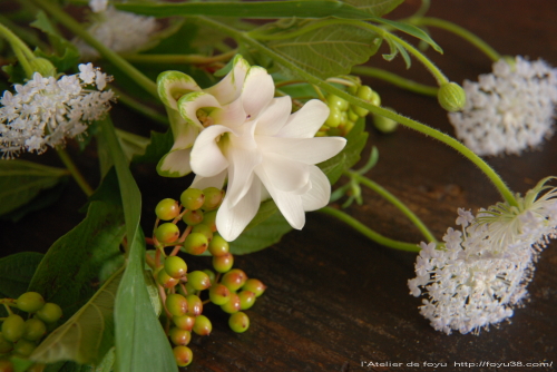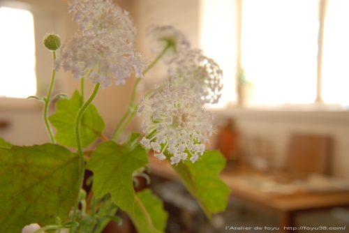前回使った柏葉紫陽花の葉が少し間延びした感はあるけれどまだ健在だったので、ブルーレースフラワーと合わせました。