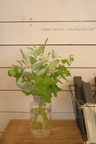 前回のブルーレースフラワー、斎花さんの言ってたとおり全部の蕾が咲き切ったもよう。その中からほんの数輪、まだあと数日楽しめそうなところだけを使って、あとは庭からミントとアキグミの葉を拝借して活けました。(得意のグリーンばかりのアレンジ!)