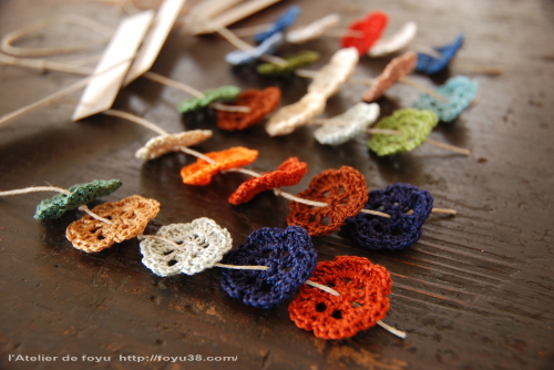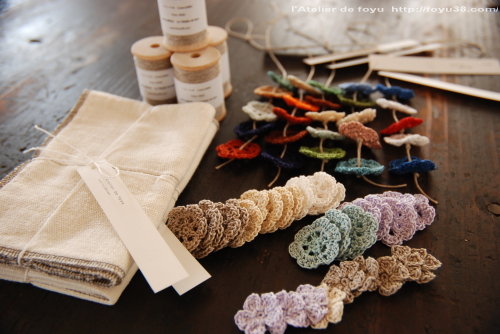 カラフルな色糸を使ってお花を一つ一つ編み、それをリネンの紐でつなげたものです。